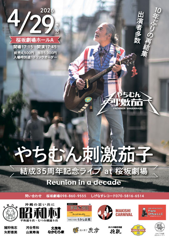 | 04月29日(祝) | 那覇 桜坂劇場ホールA 結成35周年記念ライブ OPEN/17:15 START/17:45 前売4500円/当日5000円(要1ドリンクオーダー) ![]() (問)桜坂劇場/098-860-9555 チケット/桜坂劇場窓口 しげなすレコード/070-5816-6514 |