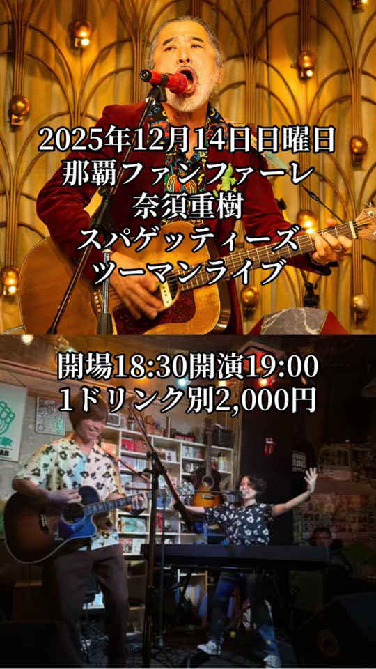 | 12月14日(日) | 那覇 那覇ファンファーレ 奈須重樹・スパゲッティーズ ツーマンライブ OPEN/18:30 START/19:00 2000円+1ドリンクオーダー ![]() (問)AZAT FANFARE/那覇市安里1-1-60 太永ビル3-A号室 TEL/090-6863-6359 |